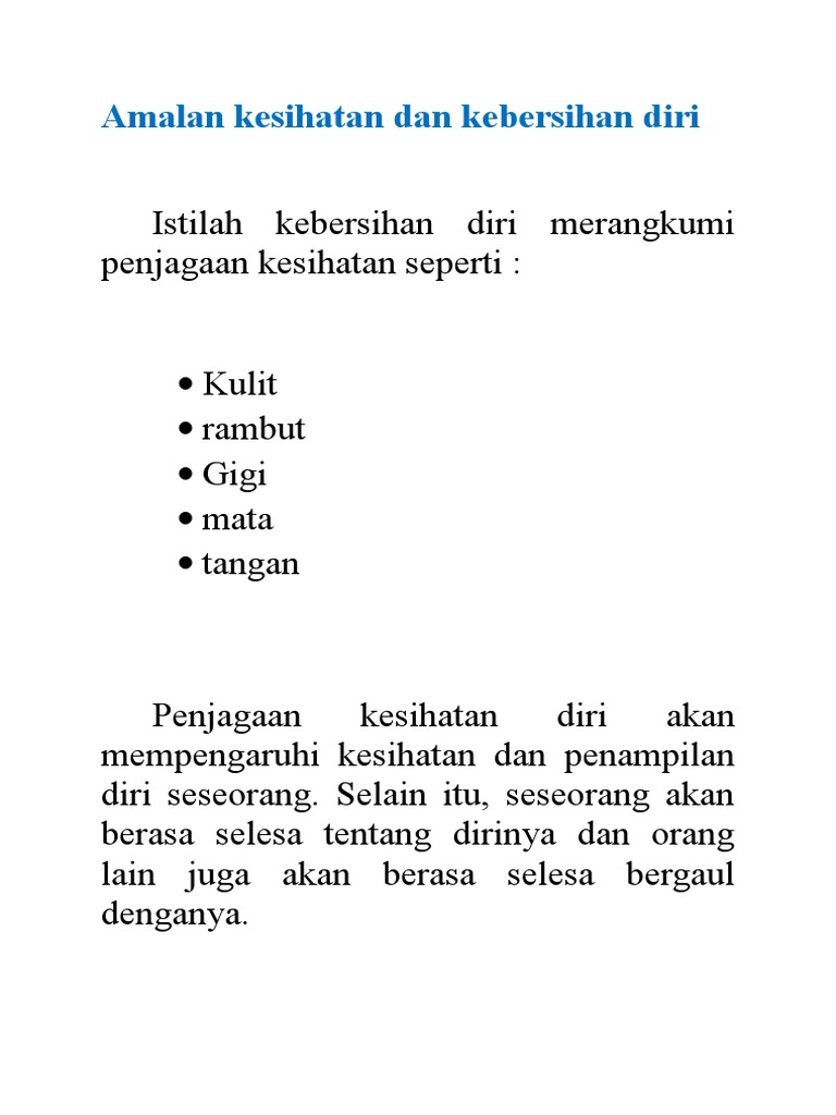 Semoga perkongsian bahan-bahan rujukan panduan bahan pembelajaran dan pengajaran contoh-contoh karangan sumber rujukan PT3 Pentaksiran Tingkatan 3 tingkatan 1 tingkatan 2 tingkatan 3 dalam post di blog Bumi Gemilang berguna. - Menjaga kebersihan diri tempat tinggal. Menjalankan pemeriksaan kesihatan secara menyeluruh sekurang-kurangnya setahun sekali untuk mengesan mendiagnosis penyakit.
