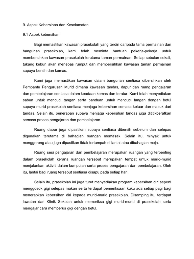 Kesihatan fizikal a Kebersihan diri 1 Murid murid mestilah diajar tentang kebersihan diri yang ditetapkan di dalam kurikulum sekolah. Kajian menujukkan kanak kanak dengan kemahiran pertuturan dan bahasa yang baik lebih bersedia untuk menerima pelajaran khasnya mereka lebih bersedia dan lebih mudah untuk belajar membaca dan menulis. Beberapa aktiviti kemahiran Kesihatan Diri boleh dijalankansamaada melalui pendidikan formal dan tidak formal di sekolah.